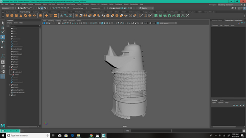 I modeled the fan, shield, and armor, and then textured the floor and armor. I ended up taking over the fire effect. I experimented with Houdini but we ended up sticking with the Maya fluid effects. I helped finalize and correct the lighting. I also sent off and had to troubleshoot rendering. I composited in Sydni's matte painting for the door and added glow in post.